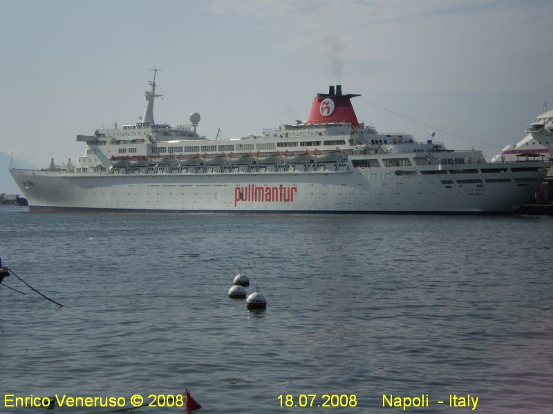 History : Built in Monfalcone Manufacturers Gathered in the Adriatic in 1965 (Impostata the 29.10.1961, launched 15. 01. 1963, delivered on 03.04.1965) Building No. 1876. Technical details of construction-39241 GRT - 8600 tpl - 206.00 x 29.40 x 19.90 m - 3 boilers - 2 groups turboriduttori - CA 55000 - 2 propellers - 27 knots - Pass.: 1601 class only. It was a transatlantic luxury, designed and built for cruising in the seas North American and the Caribbean. One can say that 'Oceanic anticipated time it was the first transatlantic large built exclusively for cruise service. His line, and its forms it were a ship at both stylistically which technically. Long edge over 238.5 m to have rational accommodation for passengers is characterized by the installation of two pools of bow and funnel, which if necessary can be covered with a real dome of steel and glass that thanks to a heating infrared ray, allows their use in cold climates and with bad weather. This system was adopted for the first time in the world on this ship, and then by many other foreign ships for the cruise service. Because of its equipment, and for the innovative equipment for navigation and safety of life at sea, its entry into service was defined as the "Ship of the Future." after the launch (03.04.1965) l 'OCEANIC dellaHome Line Inc.. -- Panama, 24. 04. 1965, from Trieste direct part in Genoa and New York and then take service between New York and the Bahamas islands. Here change various shipowners and flags and some changes in the name: 1985: Pilgrim Cruises (Greyhound Bus Co..) - Panama In 1985 ROYALE OCEANIC and then STARSHIP OCEANIC: Premier Cruise Line - Panama, in-service cruise in the Caribbean. 1998 OCEANIC: Pullmantur - Nassau 31. 12. 2003 and then Valletta.